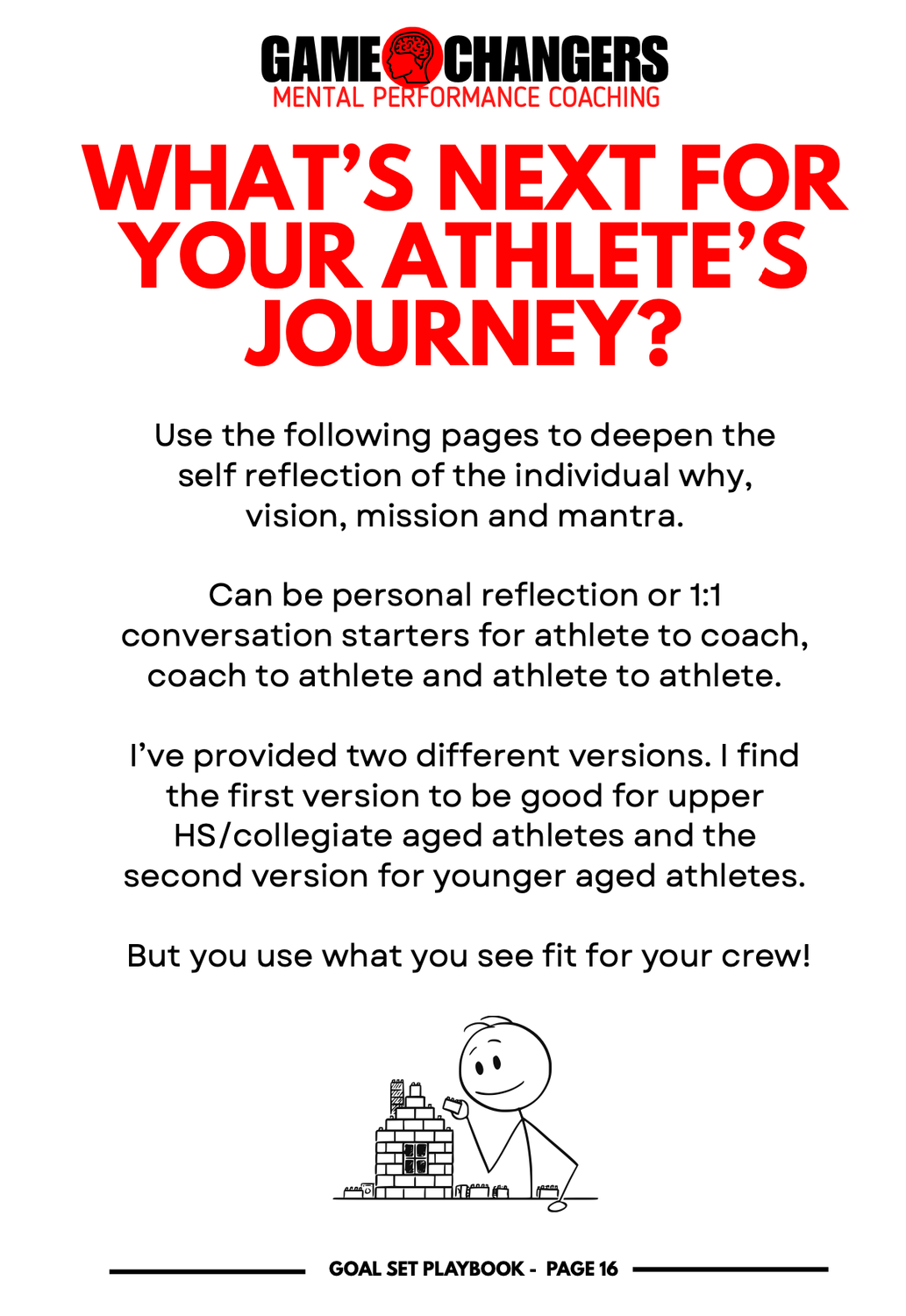 This playbook gives you structured prompts and questions to help athletes reflect, get honest, and think deeper about their goals, motivation, and commitment.